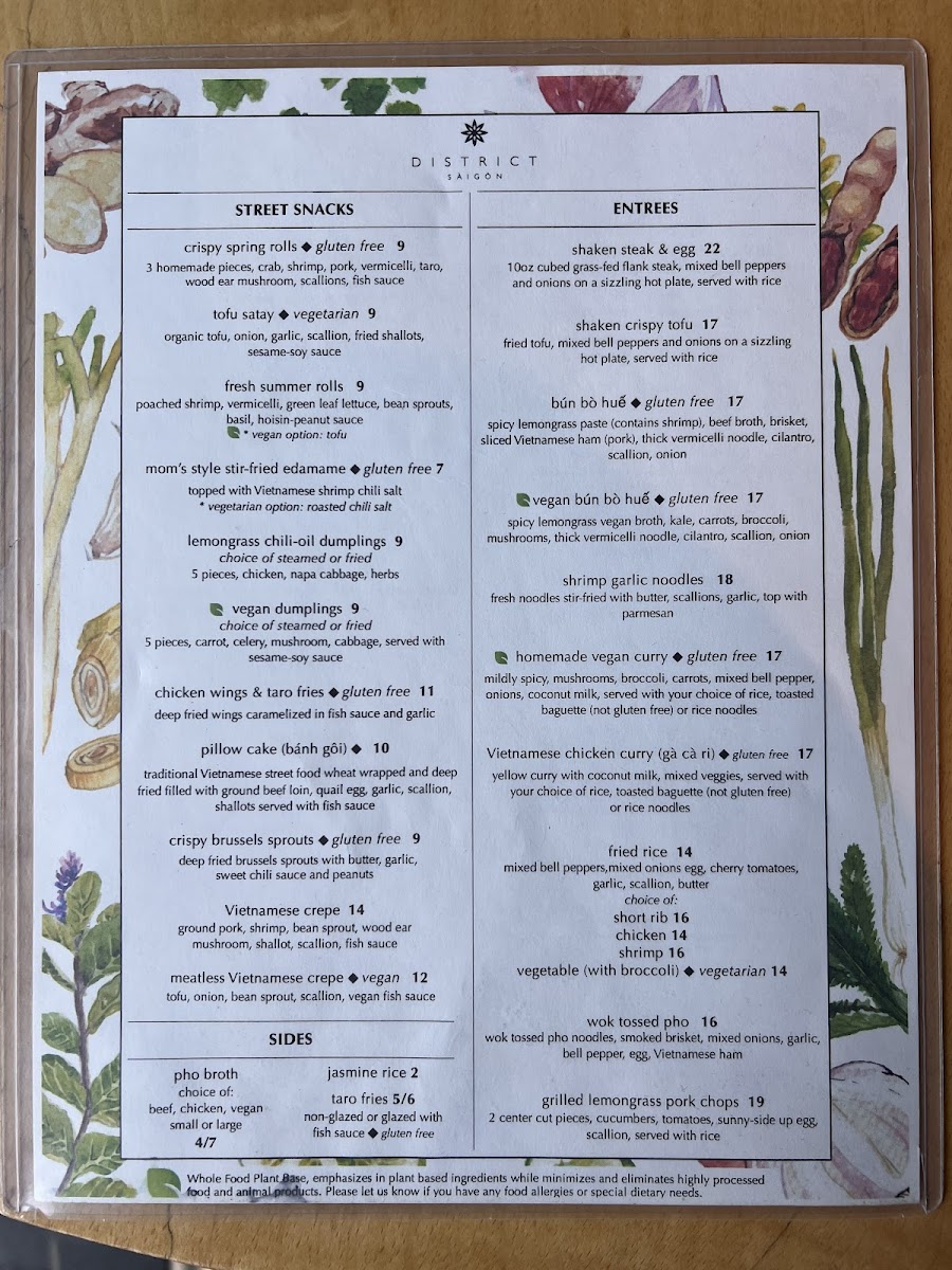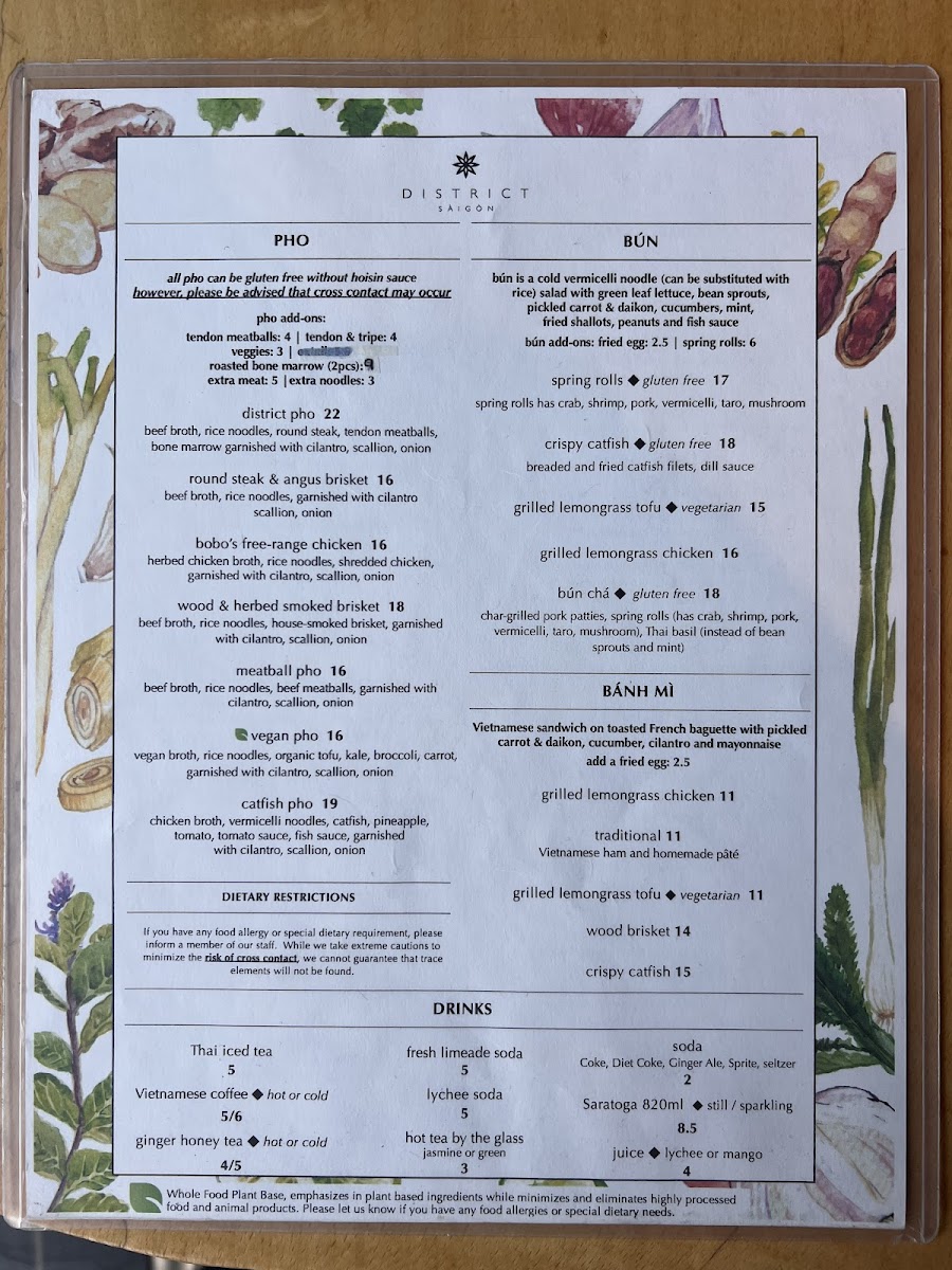 “ 6/5 rating! Visited and ordered here over a hundred times. Food and service is so good! Food: Everything is great. For apps, their chicken wings / taro fries are . Can’t help but get them every time. For mains, can’t go wrong with the phos (District Pho, Steak & Brisket, or Meatball are my favorite). Love their Traditional Bahn Mi w/ egg too- order it for takeout a lot. Tried the Shaken Steak and Egg recently and it was great too! So many good options. Service: Consistently good. We’ve never had a problem with attentiveness, refilling waters, getting ahold of someone. The place is spacious but someone’s always walking around. Great decor and interior. It’s spacious but it’s never jam packed. Even during busy meal hours we can always find a seat when dining in. When ordering out or getting delivery, service is super fast too. Love love love District Saigon! My favorite Vietnamese spot in town. ”